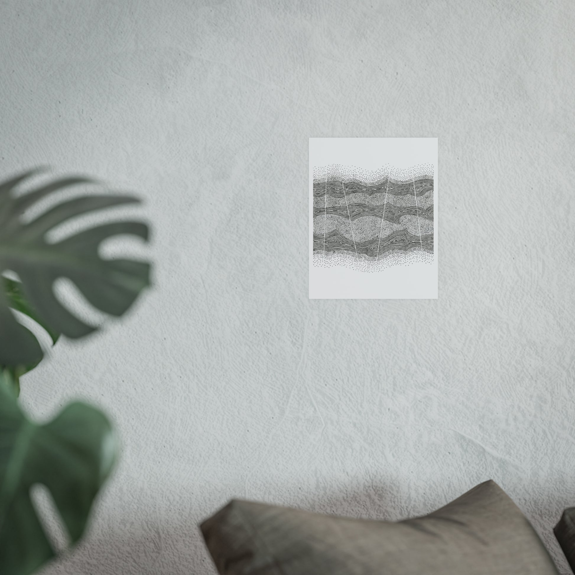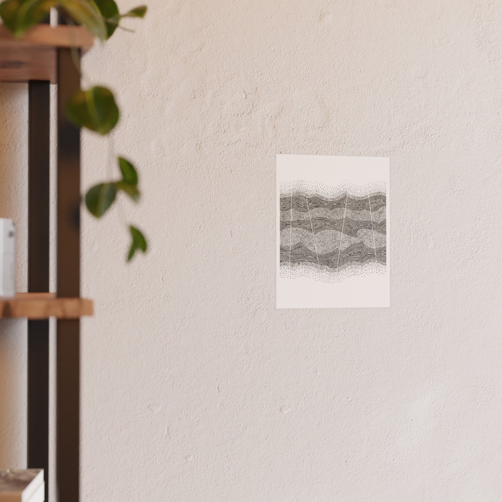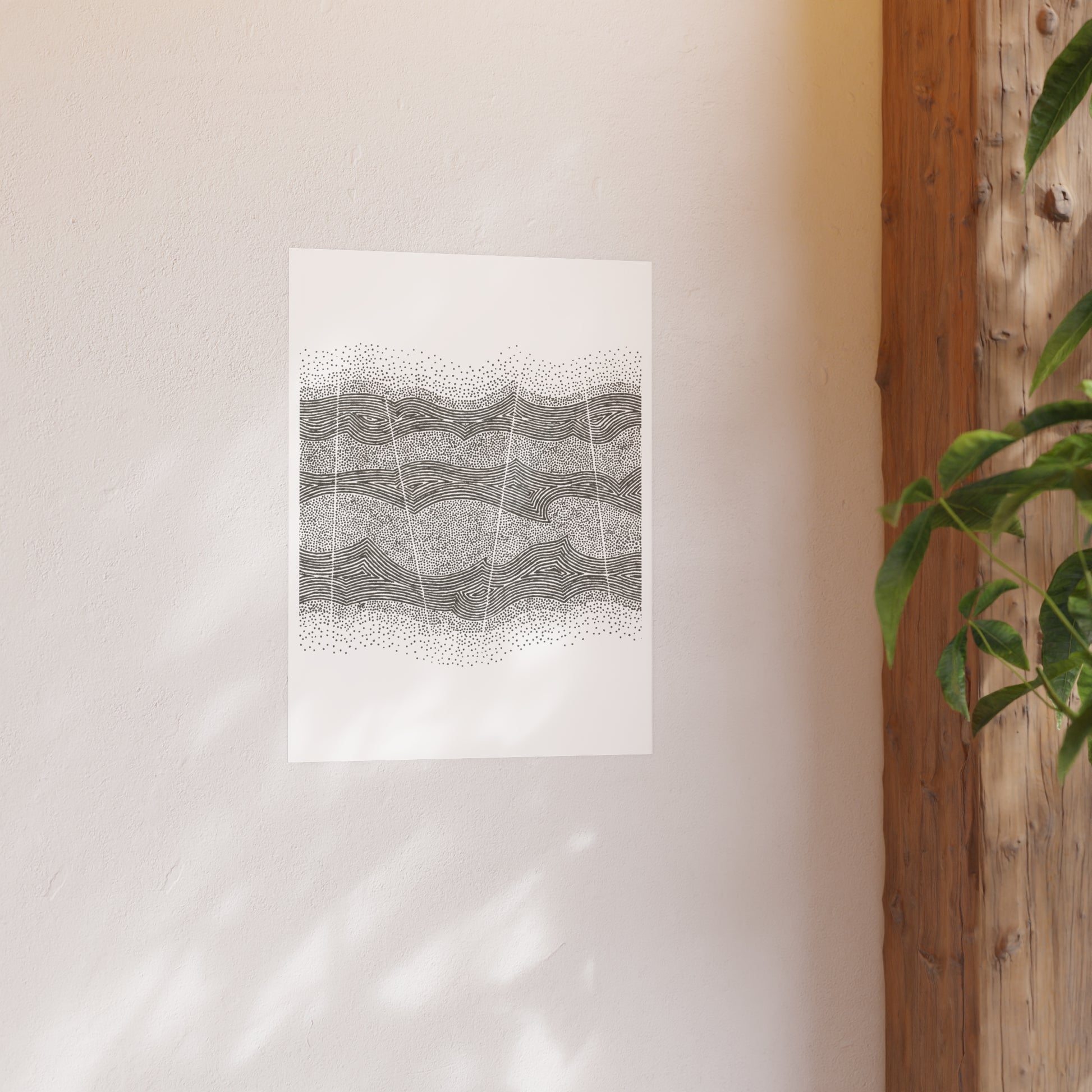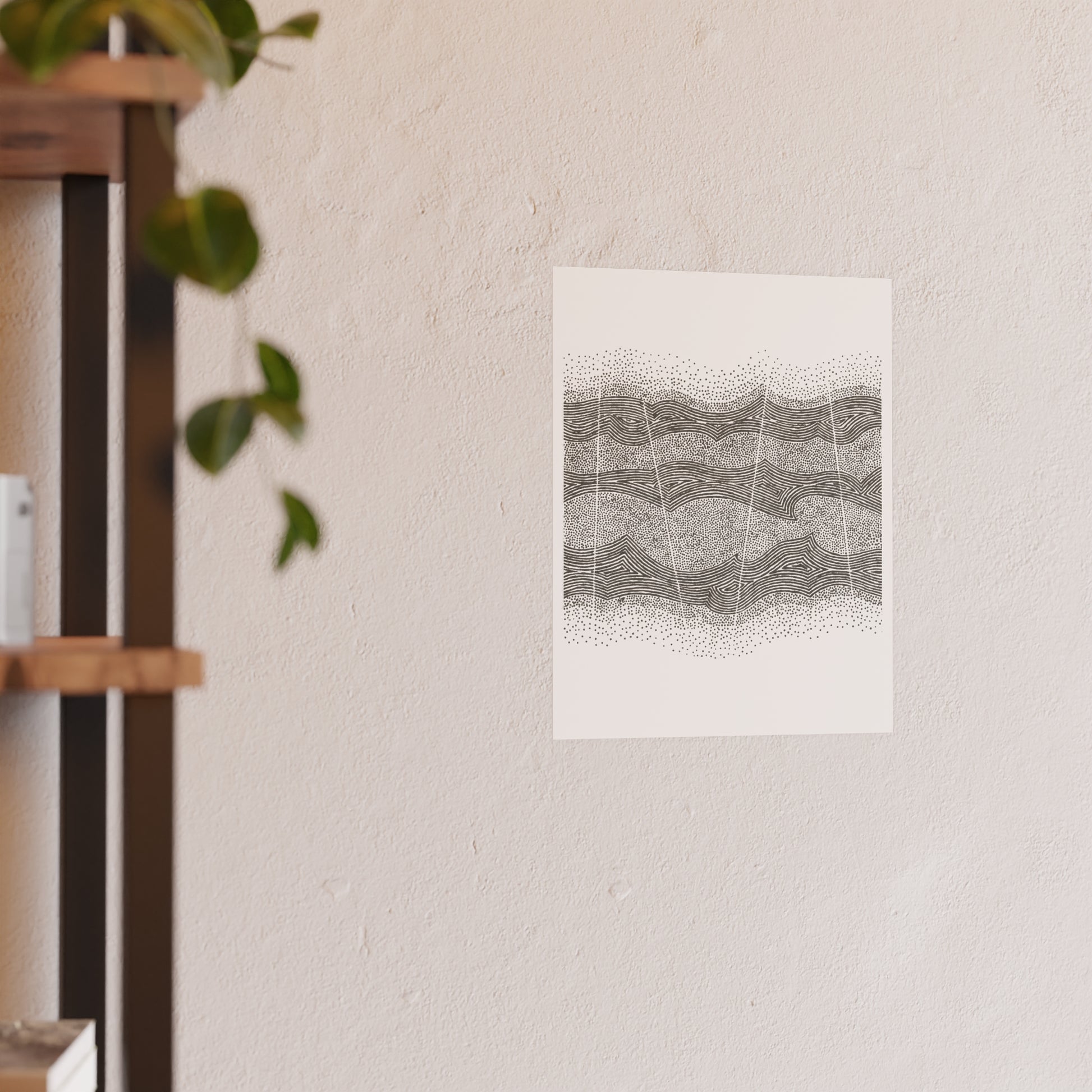 Littoral is a study in edges—layered bands drift like tide lines, and dense stippling gathers and thins the way silt settles after water moves through. Quiet from a distance, detailed up close.