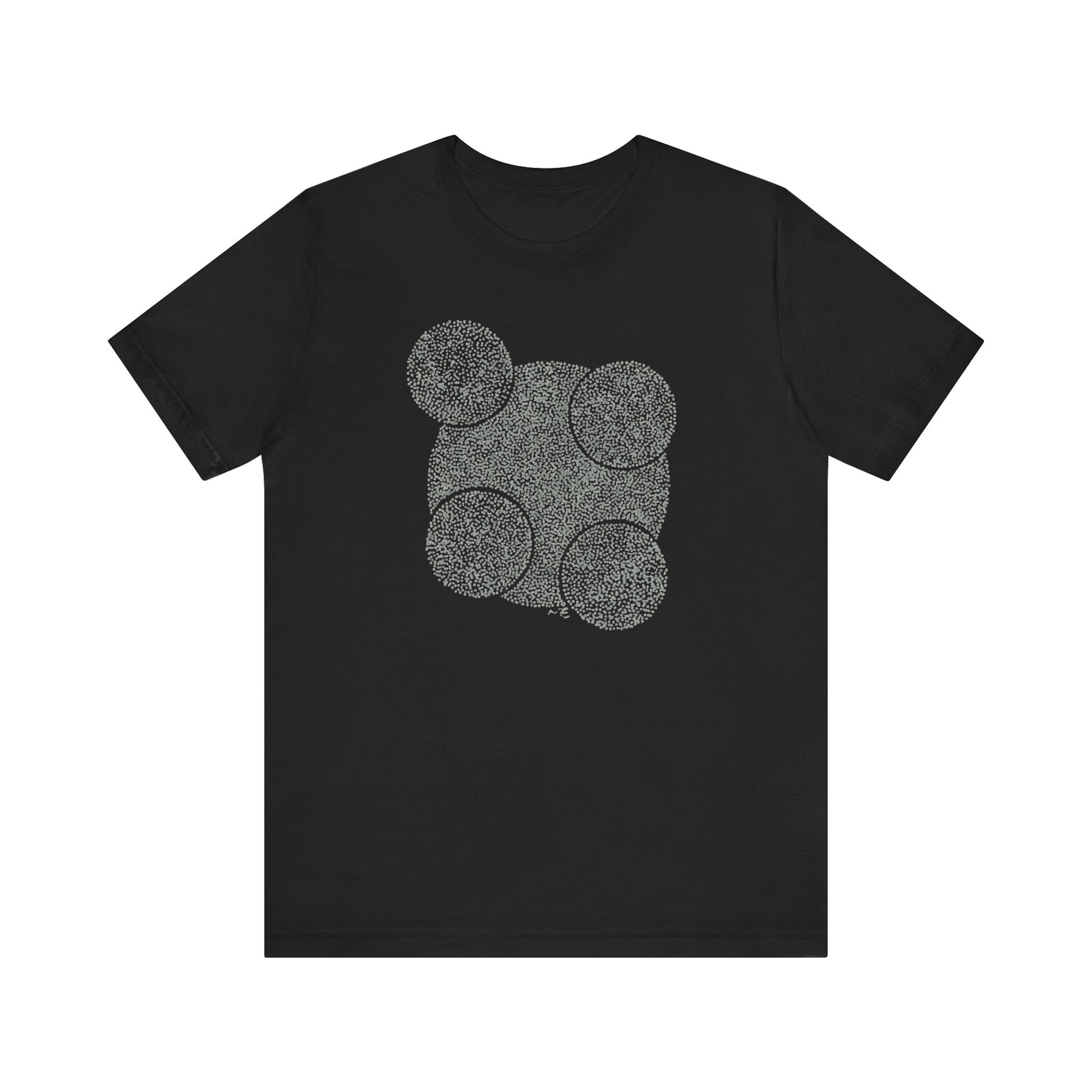 A small system of forms: clustered circles, quiet spacing, and dense stipple texture. Orrery sits on black with a restrained placement that keeps it subtle until you’re close.