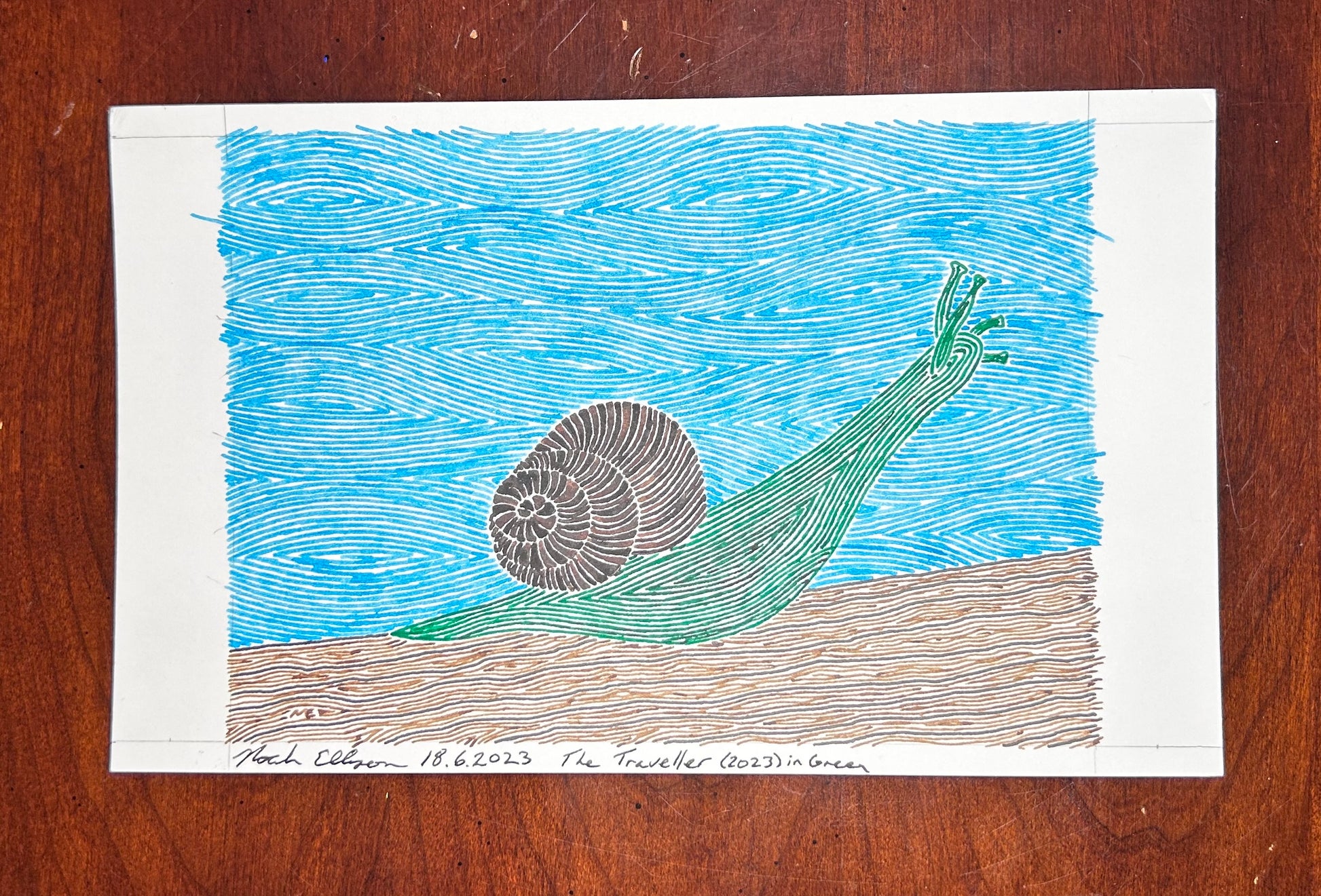 Just a snail. Recreation of an earlier piece titled "The Traveller" which was in a red ink. Just a fun thing to draw.